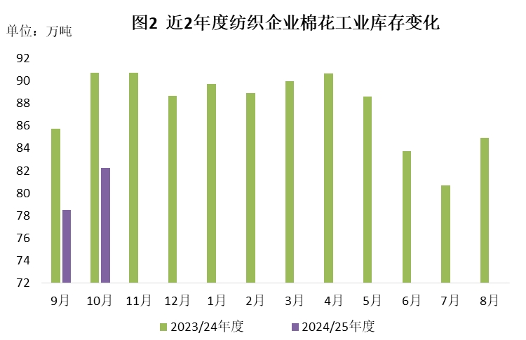 月內(nèi)隨著新棉加工逐步增加,性價(jià)比高的現(xiàn)貨資源得到補(bǔ)充,紡織企業(yè)逢低補(bǔ)庫,總體原料庫存小幅上升。截至10月31日,紡織企業(yè)在庫棉花工業(yè)庫存量為82.3萬噸,環(huán)比增加3.8萬噸,同比減少8.4萬噸。其中:34%的企業(yè)增加棉花庫存,27%減少庫存,39%基本保持不變。