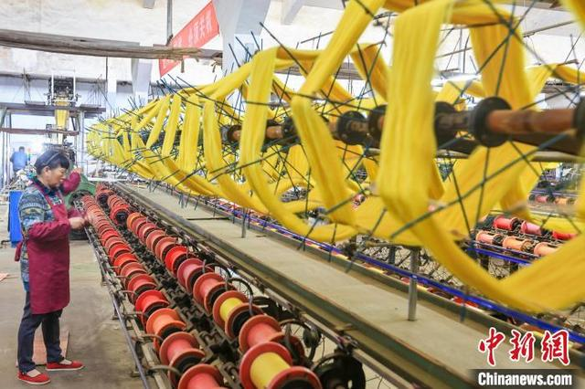 在“黃金繭”絲制品生產(chǎn)制作車間,機(jī)器聲轟鳴不斷,復(fù)搖、制綢、拉絲、制被等工序緊張有序進(jìn)行,工人們?nèi)褙炞⒌孛β抵T谶@里,一根根金黃色的細(xì)蠶絲經(jīng)過(guò)精心加工,逐漸變身為光滑細(xì)膩的彩色綢緞面料,或是舒適柔軟的“黃金”蠶絲被。