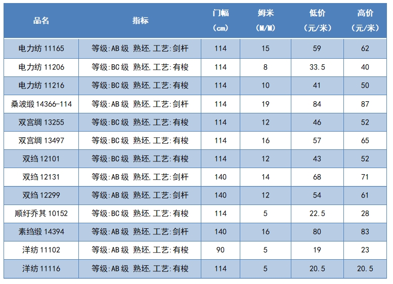 本周綢緞指數(shù)協(xié)作單位成交價格區(qū)間