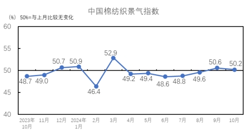 2024年10月企業(yè)經(jīng)營指數(shù)為50.6%,高于臨界點,較9月上升0.1個百分點。10月棉紡織市場處于傳統(tǒng)旺季,疊加宏觀政策利好的刺激及紗布價格的上升,紡企的營業(yè)收入和利潤總額均環(huán)比好轉(zhuǎn)。從構(gòu)成企業(yè)經(jīng)營指數(shù)的分項指標看,業(yè)務(wù)收入指數(shù)為5.2%,高于臨界點,較9月下降0.8個百分點;利潤總額指數(shù)為51.0%,高于臨界點,較9月上升0.9個百分點。