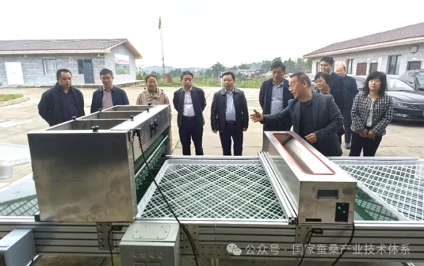 13日下午,在首席科學(xué)家的陪同下檢查組一行赴四川省南充市嘉陵區(qū)考察體系基地建設(shè)情況。首先,檢查組來(lái)到體系對(duì)接服務(wù)企業(yè)南充銀海絲綢有限公司的大通鎮(zhèn)蠶桑生產(chǎn)基地,調(diào)研了小蠶智能化共育室、自動(dòng)化養(yǎng)蠶機(jī)械裝備及有關(guān)蠶桑新品種新技術(shù),專家組對(duì)蠶桑新技術(shù)、新設(shè)備的研發(fā)應(yīng)用工作給予了充分肯定。隨后,檢查組赴體系對(duì)接服務(wù)企業(yè)四川尚好桑茶有限公司考察多元化蠶桑產(chǎn)品開(kāi)發(fā)情況,實(shí)地參觀了生產(chǎn)車間,查看桑葉茶、桑果汁、桑果干等產(chǎn)品,深入了解蠶桑多元化利用生產(chǎn)鏈,專家組表示蠶桑深度利用大有可為。期間,南充綜合試驗(yàn)站站長(zhǎng)張友洪、崗位科學(xué)家張劍飛和肖文福陪同考察并分別匯報(bào)有關(guān)情況。