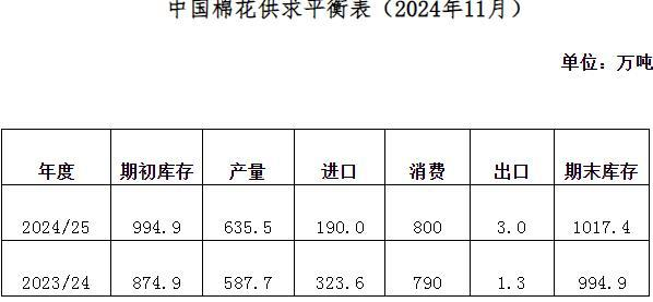 10月,在國家一系列經濟刺激政策和雙11促銷季等因素影響下,棉紡織行業(yè)需求略有改善,隨著新棉大量上市,棉花價格逐漸從高位回落。月內全國棉花采收進入高峰期,進度較上年明顯提前,市場心態(tài)趨于理性,收購價格雖同比大幅下跌,但收購秩序總體穩(wěn)定。新疆棉花豐產已成定局,期末庫存水平較高,預計全年度棉花供給仍然寬松,棉紡織行業(yè)季節(jié)性好轉可持續(xù)性不足,隨著淡季來臨,訂單出現(xiàn)下滑趨勢,企業(yè)經營壓力仍然較大。中國棉花協(xié)會11月預測:2024/25年度,全國棉花產量635.5萬噸,較上期上調15.4萬噸,同比增長8.1%;棉花進口量190萬噸,同比下降41.3%;消費量800萬噸,同比增長1.3%;期末庫存1017.4萬噸,同比增長2.3%。