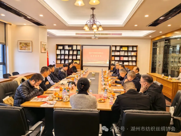 湖州市絲綢產(chǎn)業(yè)關(guān)于高檔絲綢標(biāo)志應(yīng)用與歷史經(jīng)典產(chǎn)業(yè)傳承發(fā)展部分企業(yè)座談會(huì)11月24日下午在湖州金裕絲綢科技有限公司召開,參加會(huì)議的有中國(guó)絲綢協(xié)會(huì)、浙江省絲綢協(xié)會(huì)、全國(guó)絲綢標(biāo)準(zhǔn)化委員會(huì)、湖州市經(jīng)信和信息化局、浙江理工大學(xué)湖州研究院、湖州市紡織絲綢協(xié)會(huì)和湖州市高檔絲綢標(biāo)志企業(yè)代表,與會(huì)人員共21人。會(huì)議由湖州市紡織絲綢協(xié)會(huì)凌蘭芳會(huì)長(zhǎng)主持。