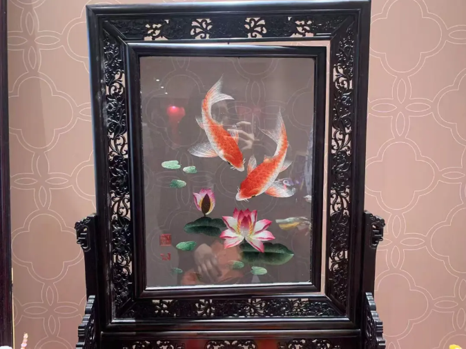 眾多作品中,雙面異色睡蓮錦鯉備受關注,該作品為“中華文化”系列雙面異色蜀繡藝術擺件。蜀繡畫面中兩條錦鯉在蓮花池中嬉戲。正面睡蓮為粉白色,或嬌艷盛開,或含苞欲放,背面睡蓮色彩依舊,水中鯉魚的顏色卻由紅色變成黑色,旋轉(zhuǎn)之間,美輪美奐,寓意“年年有余、幸福美滿”。