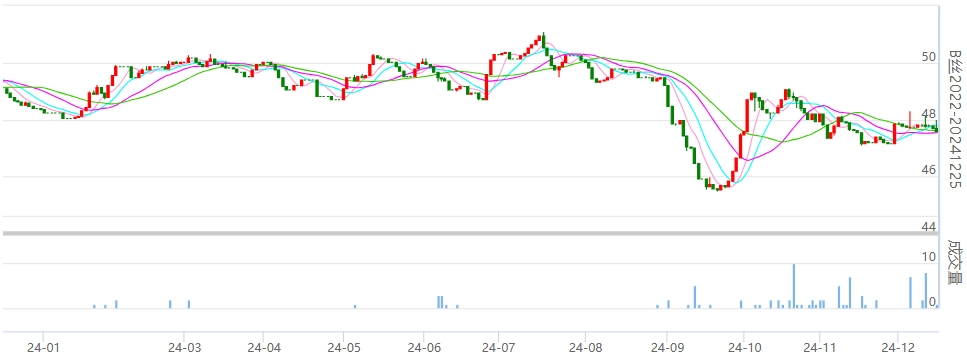 今日(2024年12月16日,周一)中國繭絲綢交易市場生絲電子指數(shù)下跌0.30%收于4680.75點(diǎn)。B絲2022D(商檢4A級生絲):241225合約下跌0.09萬元報(bào)收于47.61萬元;250325合約下跌0.12萬元報(bào)收于46.77萬元;250925合約下跌0.15萬元報(bào)收于45.99萬元。