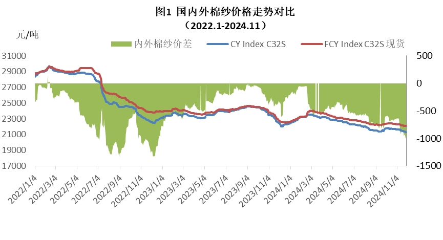 本月內(nèi)外棉紗價格均價下跌,國產(chǎn)32支純棉紗11月均價為21495元/噸,環(huán)比下跌222元,跌幅1.02%,同比下跌1624元/噸,跌幅7 %;進口32支純棉紗11月均價22186元/噸,環(huán)比下跌182元,跌幅0.8%,同比下跌1281元,跌幅5.5%。