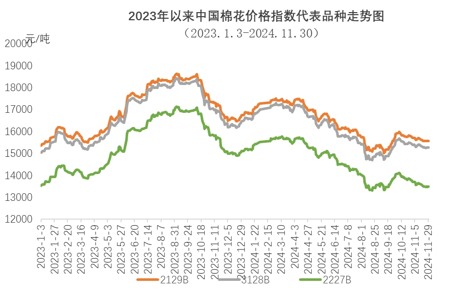 11月,棉紡織淡季特征顯現(xiàn),下游訂單整體轉(zhuǎn)弱。當(dāng)月棉花上市量大增,市場(chǎng)供應(yīng)持續(xù)寬松,中國(guó)棉花價(jià)格指數(shù)(CCIndex3128B)震蕩下跌,中上旬在15300元/噸之上波動(dòng),最高至15406元/噸,下旬震蕩回落,最低至15249元/噸,月末略有回升。中國(guó)棉花價(jià)格指數(shù)(CCIndex3128B)月均價(jià)為15327元/噸,環(huán)比下跌201元,同比下跌1499元。