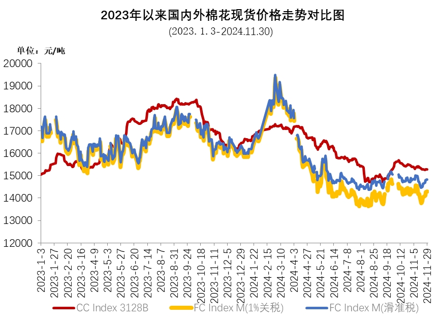 11月,國(guó)內(nèi)新棉上市量大幅增加,供應(yīng)端壓力持續(xù),棉紡織行業(yè)進(jìn)入傳統(tǒng)淡季,下游訂單整體走弱,成品庫存累積上升,部分企業(yè)為減少壓力降價(jià)銷售,皮棉采購較為謹(jǐn)慎,國(guó)內(nèi)現(xiàn)貨價(jià)格震蕩走低。同期,受美國(guó)大選結(jié)果、美聯(lián)儲(chǔ)降息預(yù)期反復(fù)、美棉裝運(yùn)數(shù)據(jù)創(chuàng)年度新高等因素影響,國(guó)際棉價(jià)先跌后漲,走勢(shì)強(qiáng)于國(guó)內(nèi),內(nèi)外棉價(jià)差有所收窄。