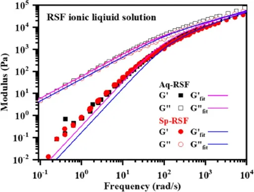圖2 30°C 時10 wt% Aq-RSF/AmimCl 溶液和 Sp-RSF/AmimCl 溶液的存儲模量和損耗模量G'和 G''隨頻率的變化而變化。這些線是基于Rouse模型的理論曲線,并結(jié)合了分子量的高斯分布。