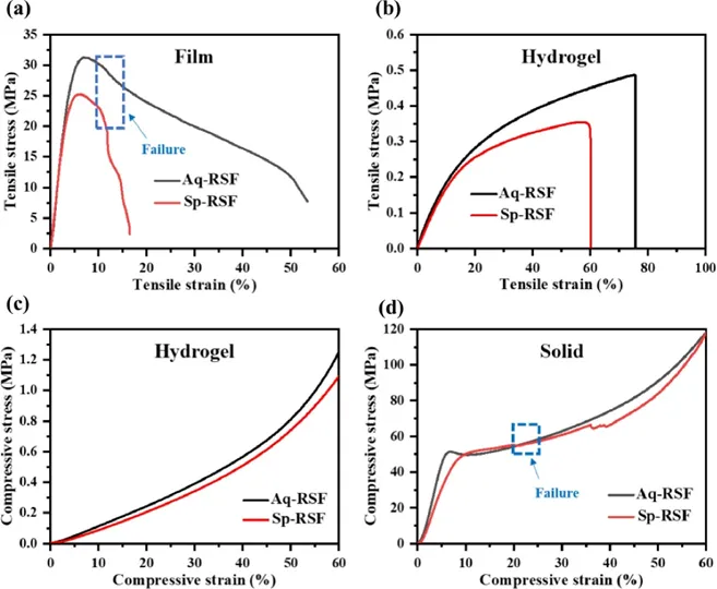 為了證明Sp-RSF粉末形成SF基材料的能力。通過溶解Sp-RSF粉末,制備了Sp-RSF基薄膜、水凝膠和固體。Sp-RSF基材料的力學(xué)性能及破壞過程與由新鮮 HMWRSF 水溶液制成的基于Aq-RSF 的材料相似(圖3)。
