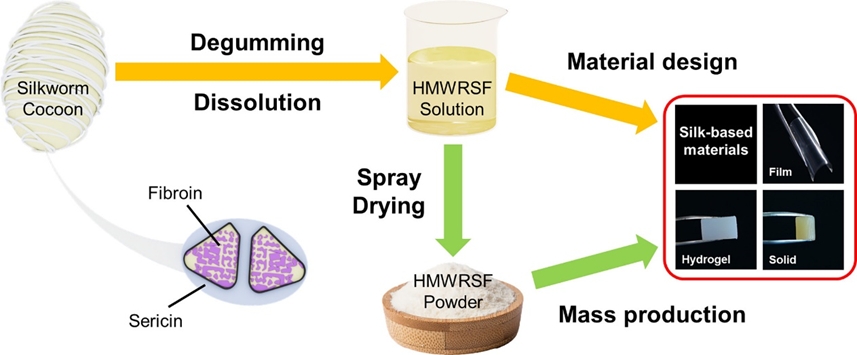 在這項研究中,報道了通過專門的噴霧干燥方法實現(xiàn)的高分子量可溶性和穩(wěn)定的Sp-RSF粉末。我們發(fā)現(xiàn)水-蛋白質(zhì)關(guān)系對Sp-RSF粉末的制備和加工至關(guān)重要。在制備過程中,低溫下的快速水分蒸發(fā)限制了SF的構(gòu)象轉(zhuǎn)變和降解。Sp-RSF鏈在干燥狀態(tài)下的低遷移率也賦予了Sp-RSF粉末長期穩(wěn)定性。在加工中,材料制造的先決條件是增強Sp-RSF的流動性。除了溶解之外,還展示了一種水輔助成型方法來制造蠶絲板。水分的引入促進了Sp-RSF的流動性和粉末在低成型溫度下的熔融。與熱成型方法相比,我們的方法減輕了絲素蛋白熱降解對生物相容性的潛在風(fēng)險。本研究可為基于水和Sp-RSF粉末組合的新方法的開發(fā)提供指導(dǎo)。我們相信,從新源材料和新加工方法的角度來看,Sp-RSF粉末可能有助于蠶絲基材料邁入新階段。