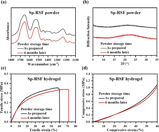 圖4 Sp-RSF粉末制備和儲存6個月的比較證明了Sp-RSF粉末的長期穩(wěn)定性。(a)Sp-RSF粉末的FTIR光譜。(b)Sp-RSF粉末的XRD數(shù)據(jù)。(c)Sp-RSF 水凝膠在拉伸試驗下的應(yīng)力-應(yīng)變曲線。(d)Sp-RSF水凝膠在壓縮試驗下的應(yīng)力-應(yīng)變曲線。