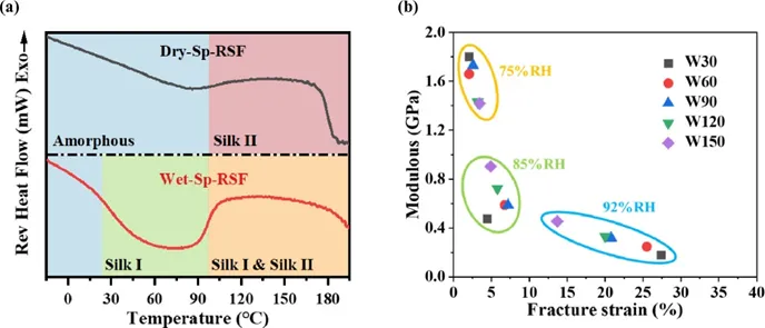 圖6(a)干燥的Sp-RSF粉末和潮濕的Sp-RSF粉末的TMDSC的反向熱流曲線。(b)由濕Sp-RSF粉末制備的蠶絲板在不同溫度(30°C/W30、60°C/W60、90°C/W90、120°C/W120 和150°C/W150)和不同濕度(75% RH、85% RH、92% RH)下的機械性能。