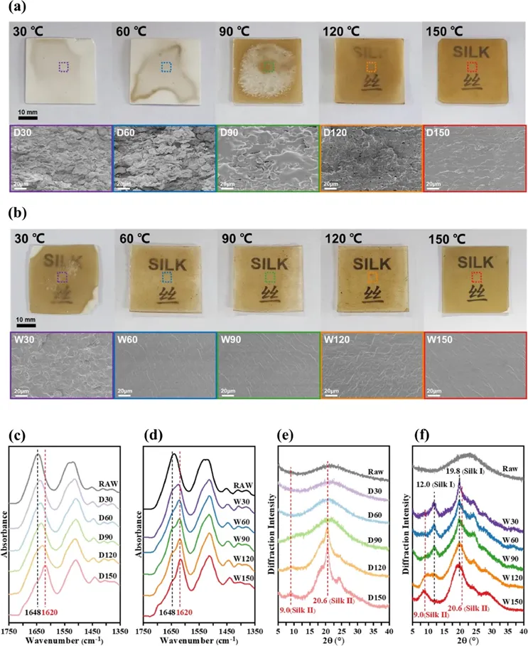 圖5 Sp-RSF 粉末的成型。由(a)干Sp-RSF粉末和(b)濕 Sp-RSF 粉末制備的絲綢板的照片和橫截面 SEM 圖像。由(c)干燥的Sp-RSF 粉末和(d) 濕的 Sp-RSF 粉末制備的絲綢板的 ATR-FTIR 光譜。由(e)干Sp-RSF粉末和(f)濕Sp-RSF 粉末制備的絲板的XRD數(shù)據(jù)。干或濕Sp-RSF 粉末在不同溫度下成型:30 °C (D/W30)、60 °C (D/W60)、90 °C (D/W90)、120 °C (D/W120) 和 150 °C (D/W150)。