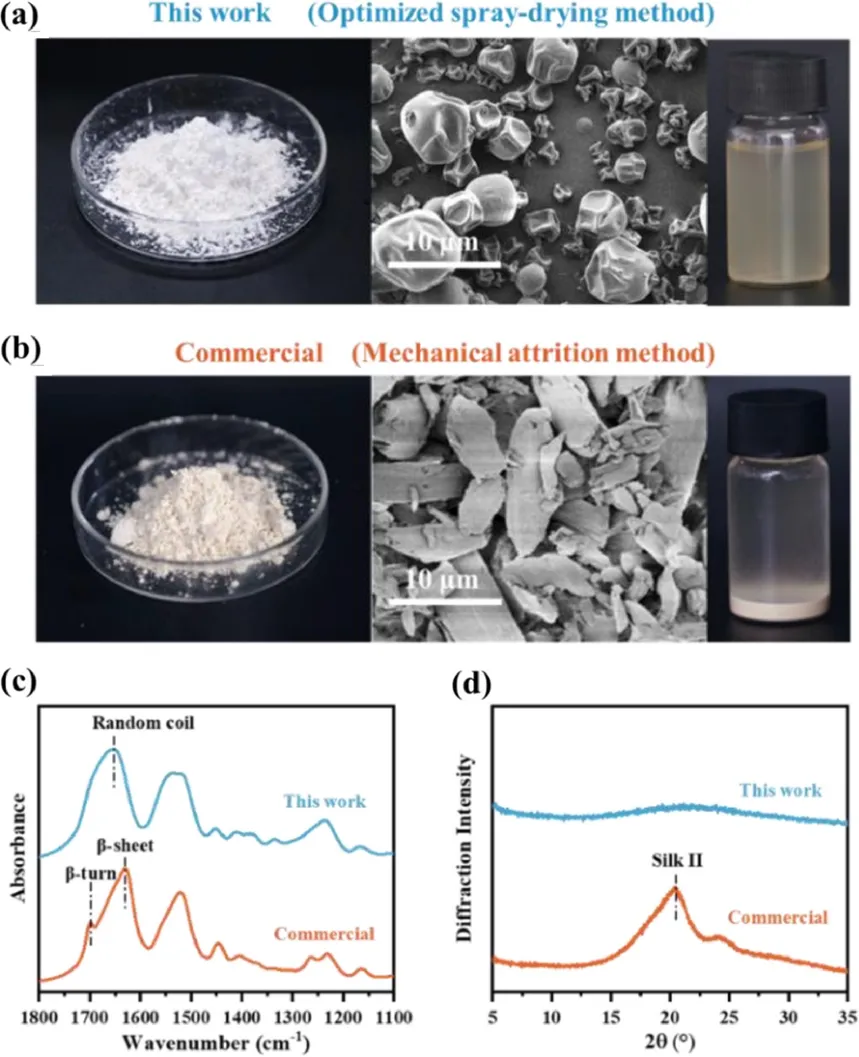 圖1 Sp-RSF粉體的制備與表征。(a) Sp-RSF粉末和(b)商用SF粉末的照片、SEM圖像和在水中的溶解度(過濾前)。(c) Sp-RSF粉末和商用SF粉末的FTIR光譜。(d) Sp-RSF粉和商用SF粉的XRD數(shù)據(jù)。