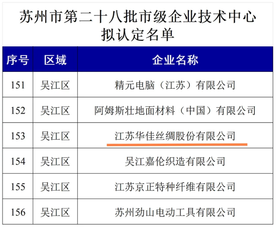 近日,蘇州市工業(yè)和信息化局發(fā)布了《擬認(rèn)定蘇州市第二十八批市級(jí)企業(yè)技術(shù)中心名單公示》,江蘇華佳絲綢股份有限公司成功通過審核,榮獲“蘇州市第二十批市級(jí)企業(yè)技術(shù)中心”殊榮。