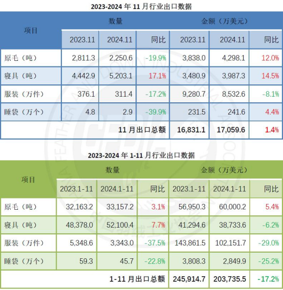 綜合前11個月來看,行業(yè)出口總額約20.4億美元,同比下滑17.2%,降幅環(huán)比1-10月繼續(xù)縮窄1.3個百分點。其中,原毛出口量和出口額均小幅增長,同比上漲幅度分別為3.1%和5.4%。寢具出口量同比上漲7.7%,但出口額下滑約6.2%。服裝出口下滑明顯,出口量值下滑幅度同比去年同期分別為37.5%、29.0%。