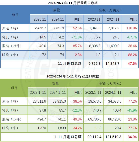 綜合1-11月來看,全行業(yè)進口約12.2億美元,同比上漲34.9%,環(huán)比1-10月漲幅擴大1.6個百分點。其中,原毛和服裝進口量值均保持快速增長,二者進口額占行業(yè)進口總額約28.5%和71.1%,原毛占比略降,服裝占比微升。