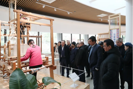 隨后,參觀團到織造館觀看“天蠶靈機:中國蠶桑絲織技藝非物質(zhì)文化遺產(chǎn)展”,近距離觀看工作人員操作織機,感受人類非遺——中國蠶桑絲織技藝的獨特魅力。