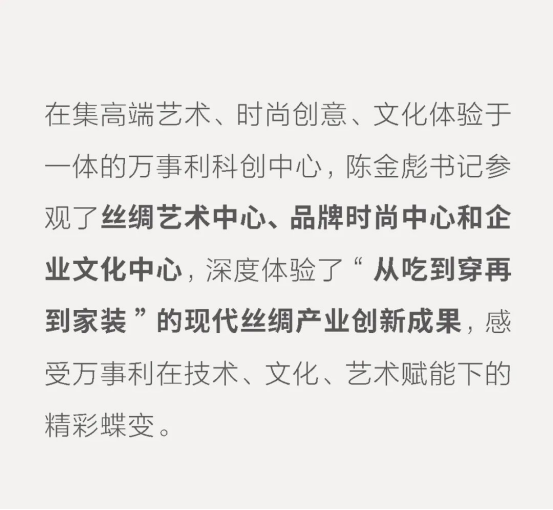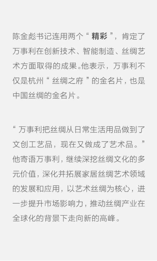 絲企新聞丨浙江省人大常委會黨組書記、副主任陳金彪連用兩個“精彩”肯定萬事利絲綢創(chuàng)新