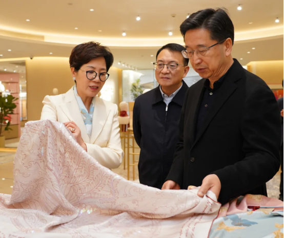 在集高端藝術(shù)、時(shí)尚創(chuàng)意、文化體驗(yàn)于一體的萬(wàn)事利科創(chuàng)中心,陳金彪書(shū)記參觀了絲綢藝術(shù)中心、品牌時(shí)尚中心和企業(yè)文化中心,深度體驗(yàn)了“從吃到穿再到家裝”的現(xiàn)代絲綢產(chǎn)業(yè)創(chuàng)新成果,感受萬(wàn)事利在技術(shù)、文化、藝術(shù)賦能下的精彩蝶變?!霸谏现芪逭匍_(kāi)的李強(qiáng)總理浙江企業(yè)家座談會(huì)上,我匯報(bào)了包括活性免水洗印染一體機(jī)在內(nèi)的萬(wàn)事利四項(xiàng)核心技術(shù),受到了李強(qiáng)總理的高度肯定?!蓖兰t燕表示。無(wú)論是“為全球80億人個(gè)性化定制”的AI花型大模型,還是“只需50平”改變傳統(tǒng)生產(chǎn)場(chǎng)景的活性免水洗印染一體機(jī),萬(wàn)事利以發(fā)展新質(zhì)生產(chǎn)力,不斷為歷史經(jīng)典絲綢產(chǎn)業(yè)注入新的動(dòng)力實(shí)現(xiàn)了從產(chǎn)品到品牌、從生產(chǎn)到消費(fèi)模式的全面革新,展示了絲綢產(chǎn)業(yè)在新時(shí)代的無(wú)限活力。陳金彪書(shū)記連用兩個(gè)“精彩”,肯定了萬(wàn)事利在創(chuàng)新技術(shù)、智能制造、絲綢藝術(shù)方面取得的成果。他表示,萬(wàn)事利不僅是杭州“絲綢之府”的金名片,也是中國(guó)絲綢的金名片?!叭f(wàn)事利把絲綢從日常生活用品做到了文創(chuàng)工藝品,現(xiàn)在又做成了藝術(shù)品?!彼恼Z(yǔ)萬(wàn)事利,繼續(xù)深挖絲綢文化的多元價(jià)值,深化并拓展家居絲綢藝術(shù)領(lǐng)域的發(fā)展和應(yīng)用,以藝術(shù)絲綢為核心,進(jìn)一步提升市場(chǎng)影響力,推動(dòng)絲綢產(chǎn)業(yè)在全球化的背景下走向新的高峰。