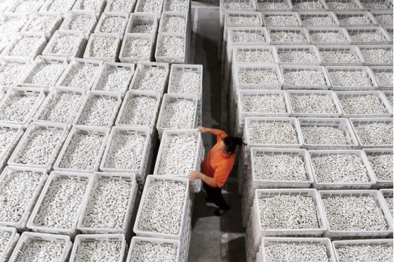 6月17日,絲綢公司生產(chǎn)車間工人將春蠶繭入庫