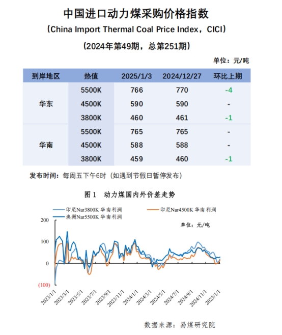 1月3日,5500K華東和華南進(jìn)口動(dòng)力煤(0, -641.00, -100.00%)采購(gòu)價(jià)分別為766/噸和765元/噸,分別較上期下滑4元/噸和持平,較國(guó)內(nèi)煤價(jià)低25-30元/噸;4500K華東和華南進(jìn)口動(dòng)力煤采購(gòu)價(jià)分別為590元/噸和588元/噸,均較上期持平,較國(guó)內(nèi)煤價(jià)低10-15元/噸;3800K華東和華南進(jìn)口動(dòng)力煤采購(gòu)價(jià)分別為460元/噸和459元/噸,均較上期下滑1元/噸,較國(guó)內(nèi)煤價(jià)低15-20元/噸。(理論測(cè)算,僅供參考)