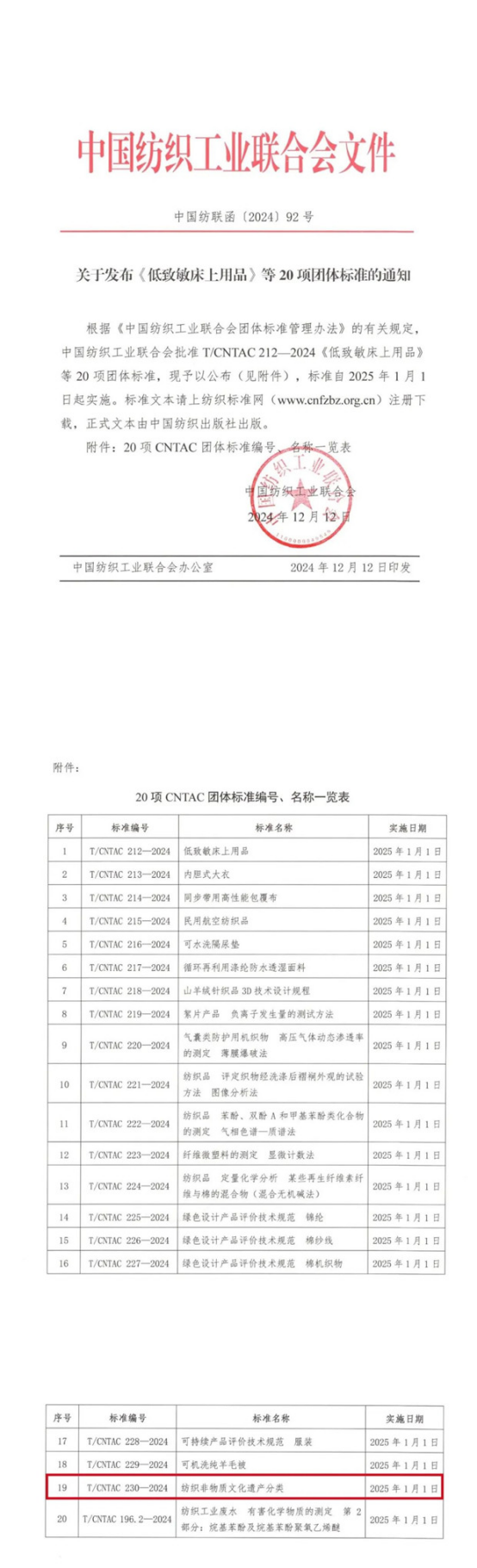根據(jù)《中國(guó)紡織?業(yè)聯(lián)合會(huì)團(tuán)體標(biāo)準(zhǔn)管理辦法》的有關(guān)規(guī)定,中國(guó)紡織?業(yè)聯(lián)合會(huì)于2024年12月31日批準(zhǔn)發(fā)布T/CNTAC230-2024《紡織?物質(zhì)?化遺產(chǎn)分類》團(tuán)體標(biāo)準(zhǔn),該標(biāo)準(zhǔn)?2025年1?1?起實(shí)施。