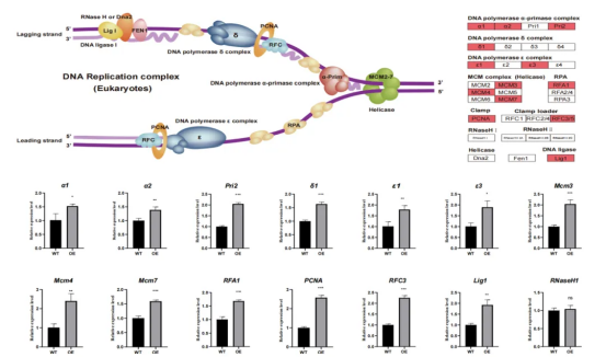 在真核細(xì)胞周期的S期,DNA復(fù)制是一個(gè)復(fù)雜的過(guò)程,涉及多種蛋白復(fù)合體的參與,包括DNA聚合酶、解旋酶、滑動(dòng)夾子和加載器,以及DNA連接酶等?;贒NA復(fù)制模型和轉(zhuǎn)錄組數(shù)據(jù)分析,課題組發(fā)現(xiàn)在BmE2F1過(guò)表達(dá)后絲腺中與DNA復(fù)制相關(guān)的基因顯著高表達(dá)。同時(shí),定量實(shí)時(shí)PCR實(shí)驗(yàn)也證實(shí)相同的結(jié)果(圖2)。