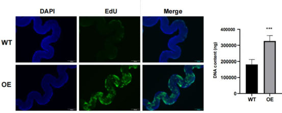 此外,該研究發(fā)現(xiàn)在家蠶絲腺細(xì)胞中過(guò)表達(dá)BmE2F1后,絲腺細(xì)胞DNA復(fù)制顯著增強(qiáng),DNA含量顯著增加(圖4)。