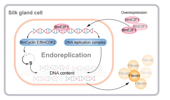 綜上,BmE2F1通過(guò)兩種機(jī)制調(diào)控家蠶絲腺細(xì)胞的核內(nèi)復(fù)制:一是增強(qiáng)DNA復(fù)制復(fù)合體的形成,二是促進(jìn)細(xì)胞進(jìn)入S期。最終,家蠶絲腺細(xì)胞中增加的DNA含量致使家蠶繭絲產(chǎn)量增加(圖5)。