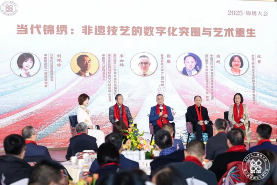 在“當(dāng)代錦繡:非遺技藝的數(shù)字化突圍與藝術(shù)重生”論壇上,浙江理工大學(xué)學(xué)術(shù)委員會(huì)副主任、中國(guó)現(xiàn)代織錦創(chuàng)立人李加林,香港科技大學(xué)(廣州)教授張康,浙江理工大學(xué)紡織品設(shè)計(jì)所主任周赳,中國(guó)工藝美術(shù)學(xué)會(huì)織錦專委會(huì)秘書長(zhǎng)沈蓓展開(kāi)跨界對(duì)話。他們從絲織技藝傳承、AI技術(shù)應(yīng)用、色彩升級(jí)、東西方文化元素融合等多維角度,探討展望傳統(tǒng)絲織技藝的絲織技藝在新時(shí)代的無(wú)限可能,續(xù)寫絲綢文化的輝煌篇章。
