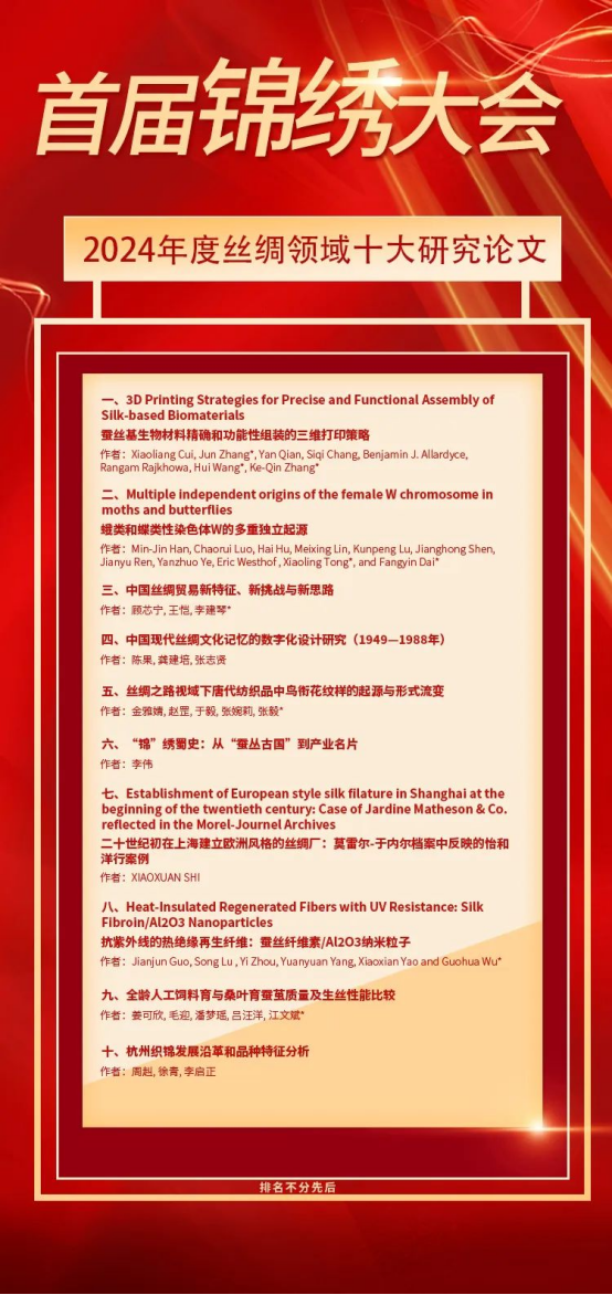 這一年,絲綢學(xué)術(shù)研究不斷取得突破,在國(guó)內(nèi)外頂尖期刊上發(fā)表了一批具有代表性、重要影響力的研究論文,展現(xiàn)了絲綢產(chǎn)業(yè)在科學(xué)與文化領(lǐng)域的深度融合與創(chuàng)新活力。浙江省絲綢文化研究會(huì)副會(huì)長(zhǎng)、《絲綢》雜志社長(zhǎng)李啟正與大家共同揭曉“絲綢領(lǐng)域年度十大研究論文”,感受學(xué)術(shù)智慧對(duì)行業(yè)發(fā)展的引領(lǐng)與推動(dòng)。