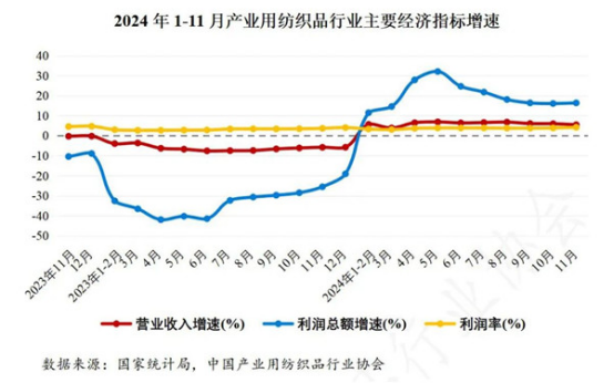 經(jīng)濟(jì)效益方面,根據(jù)國家統(tǒng)計(jì)局?jǐn)?shù)據(jù),2024年1-11月產(chǎn)業(yè)用紡織品行業(yè)規(guī)模以上企業(yè)的營業(yè)收入和利潤總額分別同比增長5.5%和16.4%,營業(yè)利潤率為4.2%,同比增加0.4個百分點(diǎn),行業(yè)盈利狀況有所改善,但與疫情前相比仍有較大差距。