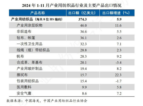 國際貿(mào)易方面,根據(jù)中國海關(guān)數(shù)據(jù)(海關(guān)8位HS編碼統(tǒng)計(jì)數(shù)據(jù)),2024年1-11月產(chǎn)業(yè)用紡織品行業(yè)出口額為374.3億美元,同比增長5.9%;進(jìn)口額為46.1億美元,同比下降3.6%。
