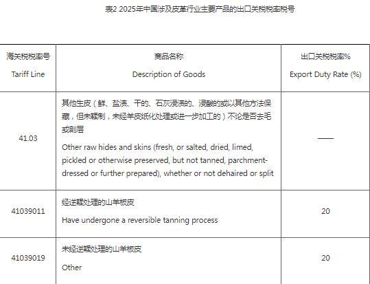 2025年中華人民共和國(guó)海關(guān)進(jìn)出口稅則已于1月1日生效實(shí)施,其中皮革行業(yè)產(chǎn)品進(jìn)出口關(guān)稅情況如下: