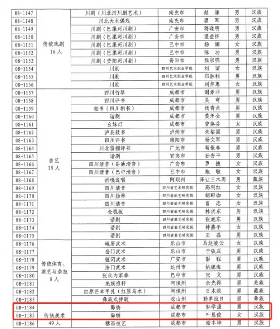 1月13日,四川省文化和旅游廳發(fā)布了《關于公布第八批省級非物質(zhì)文化遺產(chǎn)代表性傳承人和傳承團體名單的通知》川文旅發(fā)〔2025〕5號文件,確定第八批369名省級非物質(zhì)文化遺產(chǎn)代表性傳承人和5個省級非物質(zhì)文化遺產(chǎn)代表性傳承團體。其中,鄔學強、葉顯俊兩位蜀繡大師獲得四川省第八批省級非物質(zhì)文化遺產(chǎn)代表性傳承人稱號。