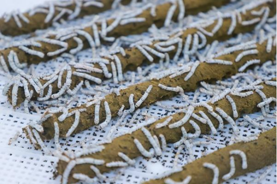 近距離觀察,這里的“蠶寶寶”居然不“挑食”——豆粕、玉米、桑葉等磨成粉末,輔以維生素等多種添加劑,制成營養(yǎng)豐富的“寶寶餐”,“蠶寶寶”們正大快朵頤。
