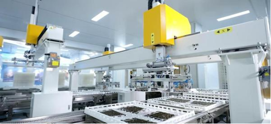 注塑車間里,多臺注塑機(jī)正開足馬力生產(chǎn)蠶筐和食槽板等物料,注塑機(jī)上方的五軸機(jī)器人,利用機(jī)械臂將生產(chǎn)好的物料進(jìn)行收集堆疊,在一旁充電休息的背負(fù)式AGV機(jī)器人,在接到指令后,將堆疊好的物料搬送到指定位置儲存。