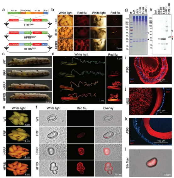 如圖2a所示,為了實現(xiàn)外源基因在家蠶后部絲腺(PSG)中的時空特異性和高效表達,研究者從家蠶基因組中擴增出了一個1967 bp長度的基礎(chǔ)Fib-H啟動子,將紅色熒光蛋白(RFP)的編碼序列(CDS)和Fib-H轉(zhuǎn)錄終止子(FibHPA)依次連接到基礎(chǔ)Fib-H啟動子下游,插入pBac轉(zhuǎn)基因載體,形成基本的Fib-HEXP系統(tǒng)(FRFEXP)。為提高FRF的轉(zhuǎn)錄效率,研究者在基礎(chǔ)Fib-H啟動子上游添加一個hr3CQ增強子,形成HFRFEXP系統(tǒng);為進一步提高外源基因的mRNA穩(wěn)定性,研究者將FibHPA替換為Ser1PA轉(zhuǎn)錄終止子,形成最終的HFRSEXP系統(tǒng)。隨后,將以上三個系統(tǒng)微注射到家蠶胚胎中,生成可持續(xù)表達RFP的可遺傳轉(zhuǎn)基因家蠶。與FRF系統(tǒng)相比,HFRS和HFRF系統(tǒng)表達的RFP分別增加了7.2倍和4.1倍,表明優(yōu)化后的HFRSEXP實現(xiàn)了天然分子量的重組蛋白在PSG中的高效表達并分泌到絲纖維中(圖2c-g)。