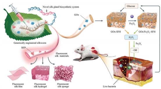 家蠶的絲腺能夠合成大量高分子量的絲素蛋白,形成絲素纖維,被認為是一種生物反應(yīng)器,可將外源蛋白整合進絲素纖維,制備功能性蠶絲生物材料。最近,受益于基因技術(shù)的應(yīng)用,絲腺有望成為大規(guī)模生產(chǎn)外源蛋白的生物反應(yīng)器。Fib-H基因表達系統(tǒng)能夠超高效合成絲纖維蛋白,是最有前途的合成外源性蛋白的系統(tǒng)。然而大多數(shù)用Fib-H系統(tǒng)表達的外源蛋白水平較低(僅占繭質(zhì)量的0.95%~6.0%),因此大規(guī)模生產(chǎn)仍是挑戰(zhàn)。本研究建立了一個高效的Fib-HEXP生物合成體系,利用轉(zhuǎn)基因蠶在絲纖維中合成大量重組RFP,占絲質(zhì)量的7.86%,實現(xiàn)了熒光絲蛋白(SF)生物材料的制備。通過基因工程葡萄糖氧化酶(GOx)功能化絲纖維驗證了Fib-HEXP系統(tǒng)的普適性。制備了葡萄糖/葡萄糖酸/過氧化氫水凝膠,通過葡萄糖酸和過氧化氫的酶催化反應(yīng),促進小鼠感染糖尿病創(chuàng)面的愈合。
