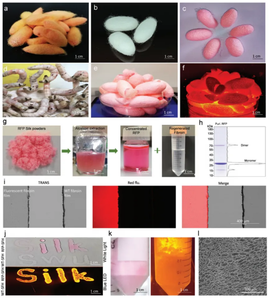 為提高HFRS系統(tǒng)的繭產(chǎn)量,研究者將其與富含絲膠的棉繭家蠶品系雜交至少5代,以繭大小、顏色、繭殼重量篩選為穩(wěn)定的生產(chǎn)線,生產(chǎn)大量粉紅色蠶絲(圖3a-f)。將粉紅色蠶絲酶解、層析,可獲得純化純度超過98%的RFP,剩余的絲纖維可制備再生絲素溶液(圖3g-h)。將純化RFP與再生絲素溶液按所需比例混合可獲得RFP-絲纖維溶液,可用于制備RFP熒光纖維薄膜、注射水凝膠、多孔海綿等各種材料(圖3i-l)。