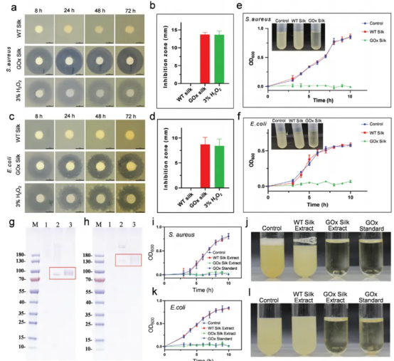 在葡萄糖存在下,研究者將GOx-silk與細菌共培養(yǎng),證明GOx-silk能抑制金黃色葡萄球菌和大腸桿菌附著生長,甚至強于3% H2O2,表明GOx-silk不斷催化葡萄糖生成H2O2,形成持續(xù)的抗菌效果(圖4j-k,圖5a-f)。另外,可將GOx從蠶絲中提取出來,不破壞其結(jié)構(gòu)和抑菌作用(圖5g-j)。
