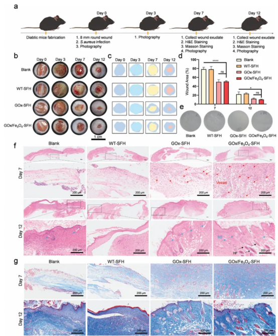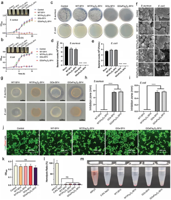 將金黃色葡萄球菌和大腸桿菌的培養(yǎng)液與GOx/Fe3O4-SFH水凝膠共培養(yǎng)10h,結(jié)果表明GOx/Fe3O4-SFH水凝膠能夠顯著抑制金黃色葡萄球菌和大腸桿菌的生長,掃描電鏡顯示菌體表面不規(guī)則、萎縮,表明細菌死亡(圖7a-i)。GOx/Fe3O4-SFH水凝膠以100μg/mL劑量處理NIH-3T3細胞,沒有明顯的細胞死亡,CCK8實驗進一步表明GOx/Fe3O4-SFH水凝膠與NIH-3T3細胞具有良好的相容性(圖7j-k)。GOx/Fe3O4-SFH水凝膠與紅細胞接觸后未觀察到溶血現(xiàn)象,說明水凝膠具有良好的血液相容性(圖7l-m)。