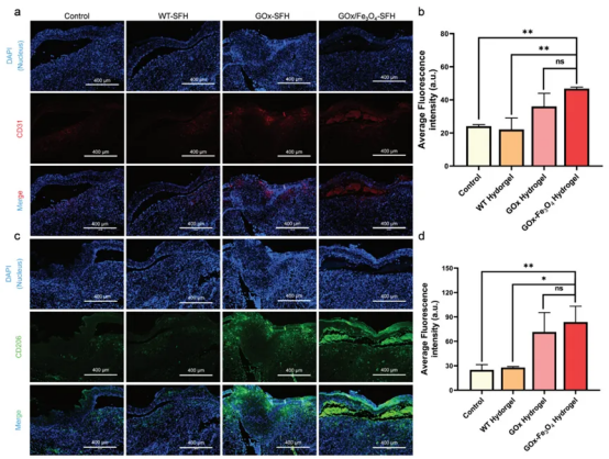 研究者采用糖尿病小鼠模型,如圖8a所示,在小鼠背部切除皮膚形成直徑8mm的全厚度傷口,金黃色葡萄球菌感染30min后,將GOx/Fe3O4-SFH水凝膠覆蓋在傷口上。12天后,GOx/Fe3O4-SFH水凝膠傷口僅剩余11.14%沒有愈合,未愈合傷口處幾乎檢測不到金黃色葡萄球菌(圖8b-e)。H&E結(jié)果顯示傷口處出現(xiàn)相對連續(xù)和扁平的上皮細胞,真皮層發(fā)育良好,并存在毛囊和皮脂腺(圖8f),Masson結(jié)果顯示膠原纖維交織排列(圖8g),免疫熒光結(jié)果顯示組織中CD31(血管生成標記物)和CD206(M2標記物)顯著增強,表明血管生成加速,巨噬細胞從M1型向M2型極化(圖9)。綜上,GOx/Fe3O4-SFH水凝膠能夠有效抑制金黃色葡萄球菌的生長,從而顯著促進慢性傷口愈合。