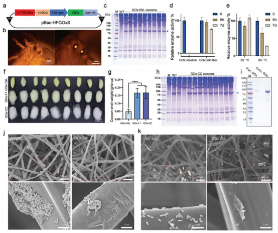 葡萄糖氧化酶(GOx)是一種結(jié)合葡萄糖并催化其轉(zhuǎn)化為葡萄糖酸和過氧化氫(H2O2)的天然酶,被認為是糖尿病創(chuàng)面中抗菌和調(diào)節(jié)高糖微環(huán)境的候選酶。因此對于開發(fā)一種能夠合成GOx、固定GOx、保持GOx活性,實現(xiàn)可控GOx釋放的載體需求很高。為實現(xiàn)GOx在家蠶絲中的高效表達,研究者將黑曲霉GOx成熟肽編碼序列根據(jù)家蠶的密碼子使用偏好進行優(yōu)化,并插入到HFRSEXP中形成轉(zhuǎn)基因表達載體pBac-HFGOxS(圖4a)。隨后,將pBac-HFGOxS微注射到家蠶胚胎中,生成可持續(xù)表達GOx的可遺傳轉(zhuǎn)基因家蠶。獲得的蠶絲中GOx含量可達80g/kg,活性達32000U/g蠶絲,GOx穩(wěn)定性大幅提高(圖4c-e)。如圖4f-i,研究者將上述轉(zhuǎn)基因蠶與富絲和棉繭蠶品系多次雜交,實現(xiàn)含GOx蠶絲的大量生產(chǎn)(含1.38g GOx/1kg蠶絲,純度超95%,活性達425U/mg)。