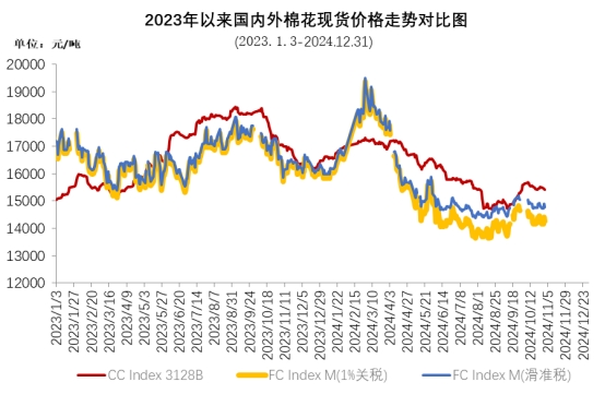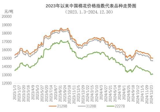 12月,國內(nèi)新棉供應(yīng)量繼續(xù)增加,棉紡織市場處于傳統(tǒng)淡季,下游需求進(jìn)一步收縮,企業(yè)訂單嚴(yán)重不足,庫存壓力凸顯,原料采購意愿不強(qiáng),國內(nèi)現(xiàn)貨價格走低。同期,受美聯(lián)儲降息預(yù)期降低及美元走高影響,中旬國際棉價跌至全年最低點,隨后因美棉裝運數(shù)據(jù)好轉(zhuǎn)略有反彈。
