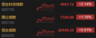 1月21日消息,港股三大指數(shù)集體收漲,截至收盤(pán),恒生指數(shù)(20106.551, 180.74, 0.91%)漲0.91%,報(bào)20106.55點(diǎn),恒生科技指數(shù)(4693.72, 98.52, 2.14%)漲2.14%,國(guó)企指數(shù)漲1.18%。盤(pán)面上,科網(wǎng)股普漲,小米漲超3%,美團(tuán)漲近2%,百度、京東漲近1%;半導(dǎo)體概念股集體走強(qiáng),中芯國(guó)際(41.9, 2.50, 6.34%)漲超6%;蘋(píng)果概念股漲幅居前,舜宇光學(xué)科技(70.2, 4.75, 7.26%)漲超7%;內(nèi)房股走勢(shì)活躍,碧桂園(0.57, 0.09, 17.53%)復(fù)牌大漲逾17%;汽車(chē)股齊漲,小鵬汽車(chē)漲近6%。
