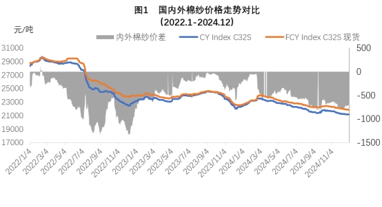 本月內(nèi)外棉紗價格均價繼續(xù)下跌,國產(chǎn)32支純棉紗12月均價為21210元/噸,環(huán)比下跌了285元,跌幅1.3%,同比下跌了1065元,跌幅4.8%;進口32支純棉紗12月均價21961元/噸,環(huán)比下跌了225元,跌幅1%,同比下跌了631元,跌幅2.8%。