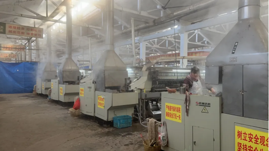在海安蘇豪,繅絲車間內(nèi)機(jī)器轟鳴,熱氣騰騰,工人們?nèi)褙炞⒌剡M(jìn)行繅絲標(biāo)準(zhǔn)化作業(yè)。一縷縷潔白細(xì)膩的絲線從蠶繭中緩緩抽出,經(jīng)過精細(xì)加工,化作高質(zhì)量的繭絲原料,為后續(xù)的生產(chǎn)環(huán)節(jié)奠定堅(jiān)實(shí)基礎(chǔ)。車間內(nèi),大家干勁十足,對新的一年充滿期待。